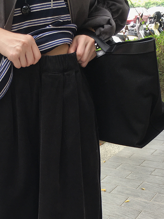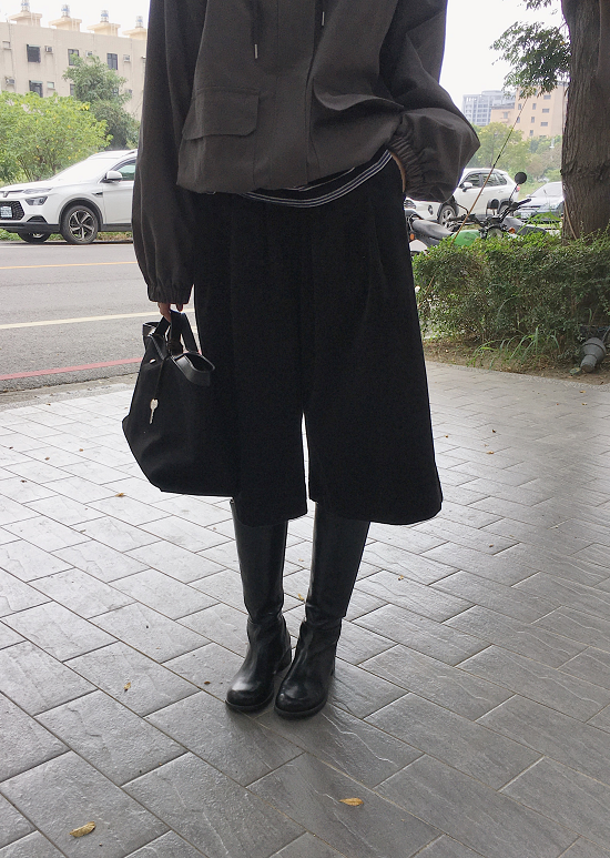 全鬆緊腰圍的大寬褲感A字剪裁跟寬打摺設計